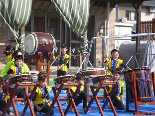 秋晴れのもと、保育園の園庭で、年長ゆり組の子ども達が和太鼓の演奏をしました。