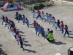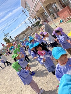 秋らしい空のもと、2歳、3歳、4歳、5歳児の子ども達で運動会を行いました。一番初めは、みんなで、元気いっぱい「いっとうしょうたいそう」を踊ってスタートしました。お遊戯やかけっこ、バルーンやフラッグ、綱引きなど、いろいろな競技にどの子も楽しみながら参加しました。5歳児さんの親子競技では、お家の方も子ども達に負けない意気込みで、一緒に楽しんでくださいました。最後は、チーム対抗で大玉転がしをして、園庭の築山までどちらのチームのボールが早くゴールするかを競って、大盛り上がりでした。お家の方もたくさん応援してくださり、とても楽しい運動会でした。