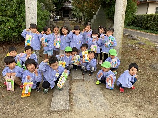保育園の近くにある神明神社に七五三のお詣りに出かけました。3歳。4歳・5歳の子ども達は一緒に手を繋いで歩いて行きました。それぞれ七五三の袋を作り、お祝いと健康と幸せを願ってお詣りしてきました。小さい子たちも、散歩車に乗ったり、てくてく歩いて行ってきました。どの子も健やかに大きくなって欲しいです。