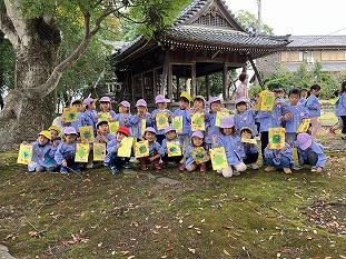 年中児が、下中町石田地区に、地域の方とのふれ合いを楽しむ「地域訪問」に伺いました。会場のお寺まで徒歩で行く予定でしたが、雨が降っていたので、通園バスで行きました。15名程の方がいらっしゃいました。初めに、ご挨拶をした後、歌を2曲聞いてもらい、たくさん拍手をいただきました。その後、一緒に手遊びをしたり、紙芝居を見たりしました。おじいちゃん、おばあちゃんの温かな手や優しい笑顔は子ども達の心に染みわたったことと思います。