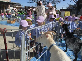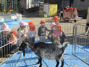 保育園に移動動物園の「プチZOO」さんが来てくれました。大きなトラックが到着すると、中から、やぎ、ひつじ、七面鳥、うさぎやモルモット、犬、インコなど、たくさんの動物が出てきました。たくさんの動物さんに「わぁ~」と大喜びでした。小さい子たちは間近で見る大きなやぎやひつじに興味津々で、じーっと見入っていました。大きい子たちは、野菜をあげたり、うさぎやモルモットにそっと触れ「ふわふわでかわいいね!」と抱っこしたり、動物さんの温かさを感じることができた貴重な経験になりました。