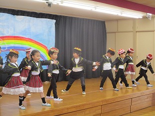 2日間に分けて行った発表会。一日目は2歳児たんぽぽ組さんと、3歳児さくら組さんが行いました。たんぽぽ組さんは、お遊戯「バナナなの?」「ぼよよん行進曲」と、「りんごコロコロ」等の手遊びを披露しました。さくら組さんは、お遊戯「初心LOVE」「キミに100パーセント」「フレンドライクミー」「いちごのうた」と、みんなで一緒に歌と楽器演奏を行いました。たくさんのお客さんに驚く様子も見られましたが、どの子も元気いっぱい踊れました!