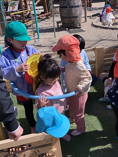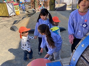 3月になり、穏やかな晴れの日も多くなり、お外でたくさん遊んでいます。大きい子達が、小さい子に自然と関わって遊んでいます。「一緒にあそぼう!かわいい!」と寄ってて遊ぶ姿がほほえましいです。