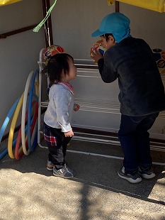 1歳児、2歳児の子ども達はシャボン玉がふわふわ飛んでいると興味津々!砂場ではおままごとや大きなお山を作ってトンネル掘り!トンネルがつながると大喜びの子ども達でした。