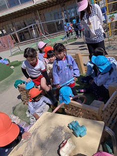 満開の桜の花が、前日の雨と風で、園庭一面に敷きつめられていました!外に出た子ども達は早速花びらを集め空へ!ひらひらと落ちてくる花びらに大喜びでした!砂場では、カップに花びらを入れケーキを作ったり、カレーにしたり、ちゅうりっぷの花びらに包んで餃子にして見せてくれる子も!いろいろアイデアを出した美味しそうなごちそうがいっぱいでした!