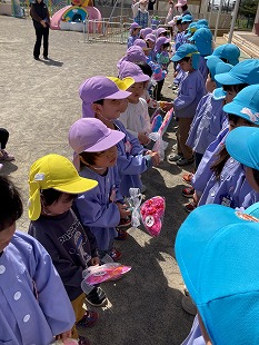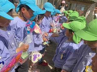 年中組さんは、牛乳パックで作った小物入れ、年少組さんは、お花紙で作ったハート型のお花をプレゼントしました。年長組さんは、お礼に、「ともだちになるために」と「にじ」の歌を手話をしながら聞かせてくれました。最後は、「ゆり組さん!いっぱい遊んでくれてありがとう!」と、拍手で年長組さんを送りました。