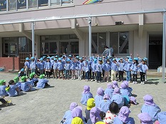 「おおごえをだす」「ちかづかない」「はなしをする」についてや、「子ども110番の家」についてのお話をどの子も真剣に聞くことができました。実際に、警察の方が悪い人に扮して、声を掛けられると逃げることができました。