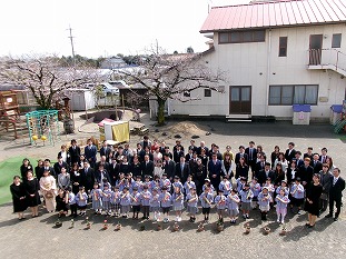 穏やかな晴天に恵まれ、年長組31名の卒園式が行われました。卒園児は名前を呼ばれると「はい!」と元気に返事をし、前に出て保育証書を受け取りました。式の後、外に出て記念撮影をし、在園児が花道を作り、その間を親子で手をつなぎお見送りをしました。小学校へ行ってもがんばってね!
