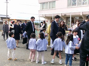 胸にお花を付けて、34名の年長組さんが入場しました。どの子も、お家の方の前で、立派に保育証書を受け取りました。朝は、雨が降っていましたが、段々と日が差してきて、外で写真撮影もできました。在園児の子たちが花道を作りとみんなでお見送りをしました。